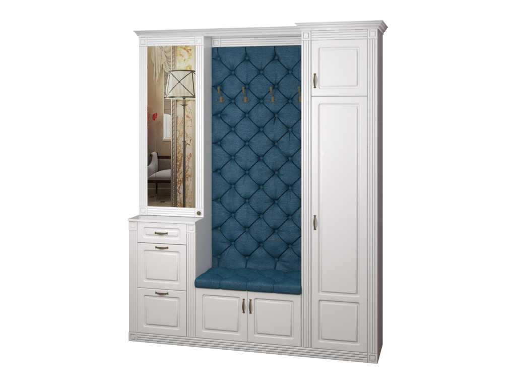 Используемый материал: корпус - ламинированное ДСП 16 мм; зеркало; фасады, карниз и пилястры - МДФ; ЛДВП. Мягкая панель декорирована каретной стяжкой. Доступен выбор вариантов ткани для обивки: это может быть велюр, рогожка или экокожа различных цветов.