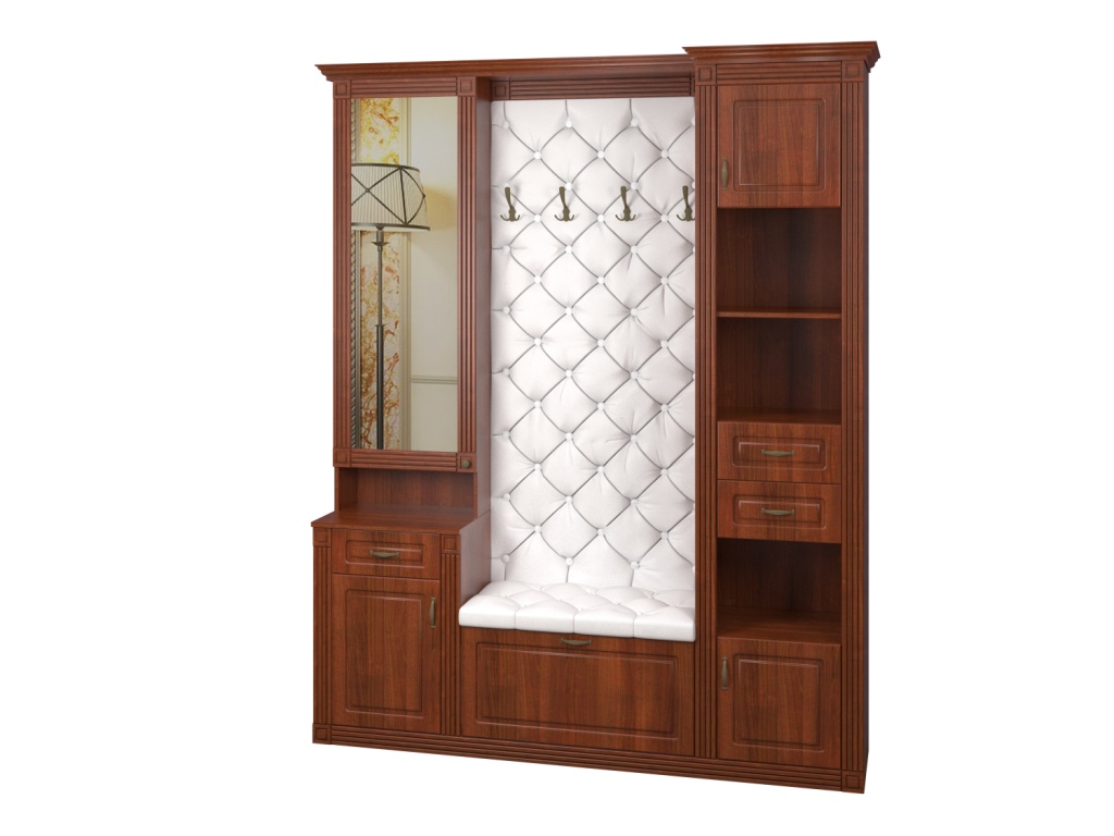 Используемый материал: корпус - ламинированное ДСП 16 мм; зеркало; фасады, карниз и пилястры - МДФ; ЛДВП. Мягкая панель декорирована каретной стяжкой. Доступен выбор вариантов ткани для обивки: это может быть велюр, рогожка или экокожа различных цветов.