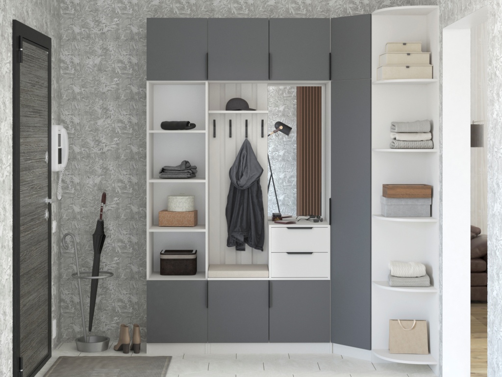 Во вкладке "Выбрать модули" Вы можете подобрать различные по комплектации шкафы, вешалки, угловой элемент. Модульная система поможет подобрать вам необходимые модули, с учетом размеров помещения, планировки.