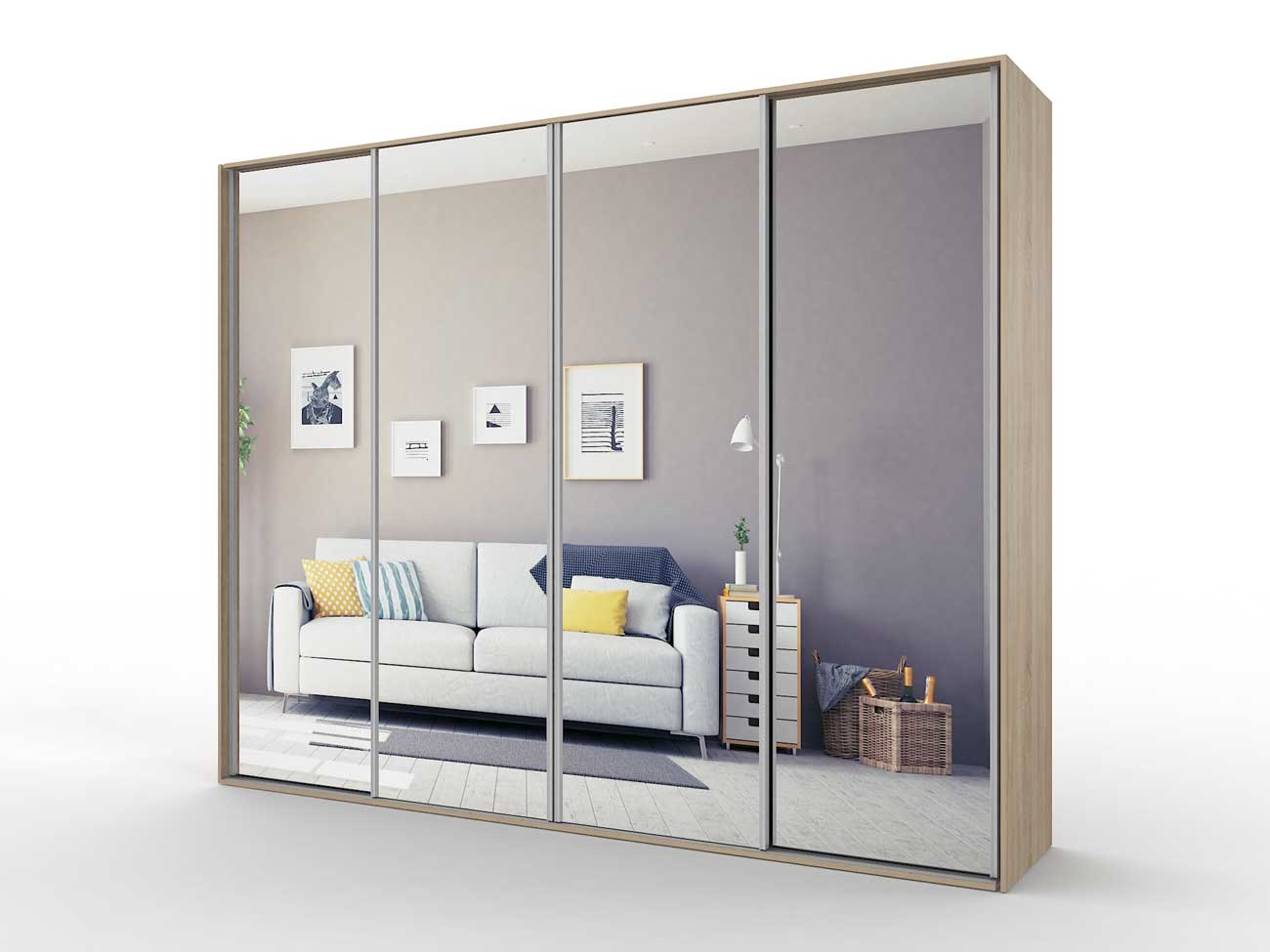 В базовую комплектацию шкафа входит кромка 0.4 мм, ручки торцевые, ламинированное ДСП 16 мм, ламинированное ДВП, направляющие Версаль, ходовые ролики РКМ-70, зеркало