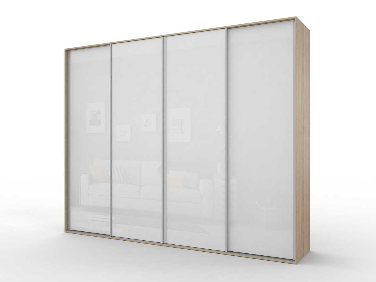 В базовую комплектацию шкафа входит кромка 0.4 мм, ручки торцевые, ламинированное ДСП 16 мм, ламинированное ДВП, направляющие Версаль, ходовые ролики РКМ-70, цветное стекло