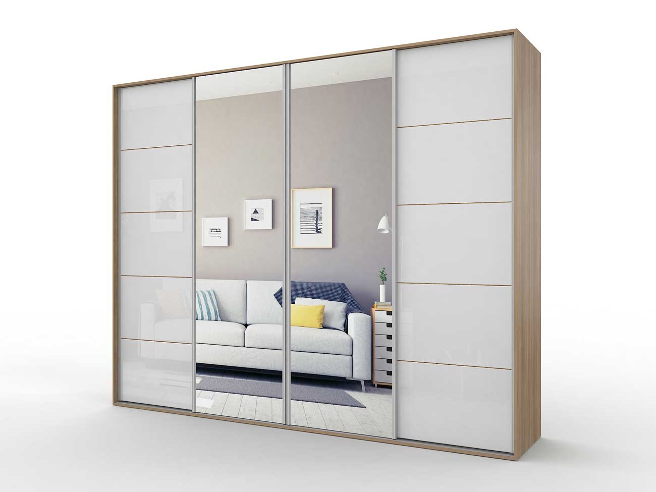 В базовую комплектацию шкафа входит кромка 0.4 мм, ручки торцевые, ламинированное ДСП 16 мм, ламинированное ДВП, направляющие Версаль, ходовые ролики РКМ-70, цветное стекло, зеркала