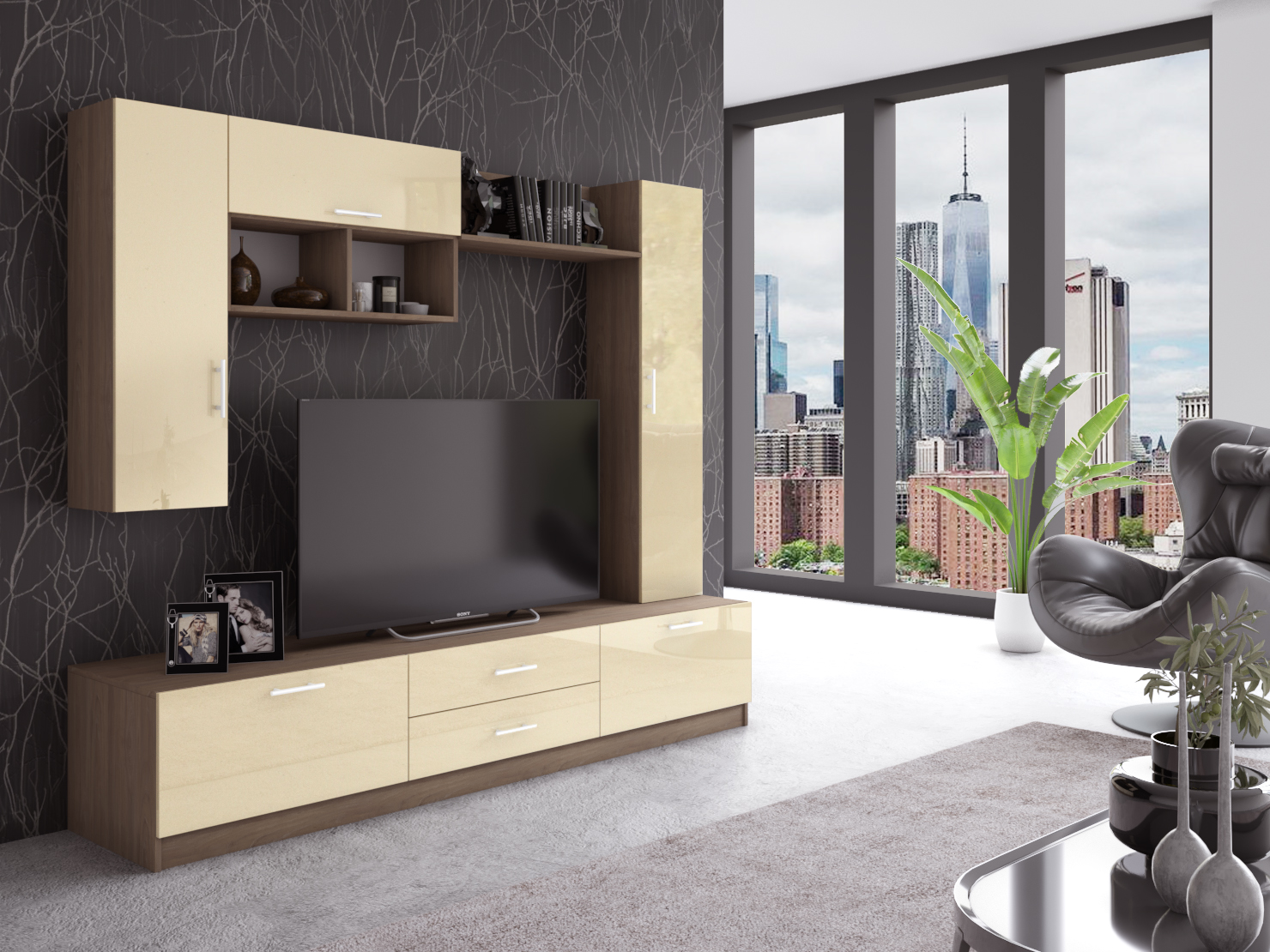 Тумба ТВ: по центру 2 ящика, по бокам двери открываются вниз. Направляющие ящиков шариковые 100% полного выдвижения. Пенал: 4 полки. Пенал навесной: 2 полки. Шкаф навесной: дверь открывается вверх, за дверью 1 отделение.