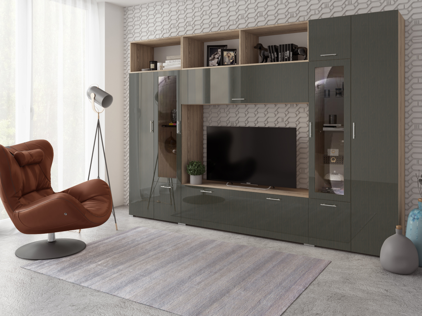 Шкаф с антресольной нишей: все двери распашные. Дверь глухая 3 полки, дверь со стеклом 3 стеклополки. Тумба ТВ: дверь открывается вниз, за дверью 2 отделения. Навесной шкаф: дверь открывается вверх на газлифтах, за дверью 2 отделения. Шкаф комбинированный, дверь глухая 4 полки, за дверью со стеклом 3 стеклополки.