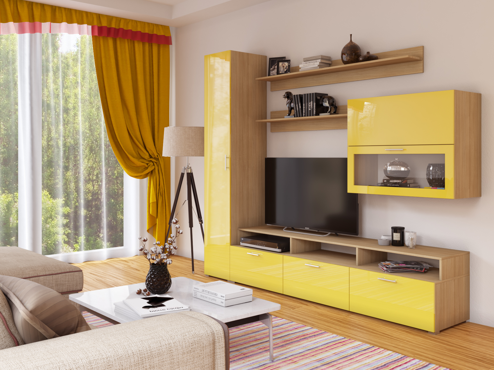 Пенал: 4 полки. Тумба ТВ: 3 выдвижных ящика. Направляющие ящиков шариковые 100% полного выдвижения. Шкаф навесной: 2 отделения, нижнее дверь открывается вниз, верхнее отделение дверь открывается вверх на газлифтах, открытие по нажатию.